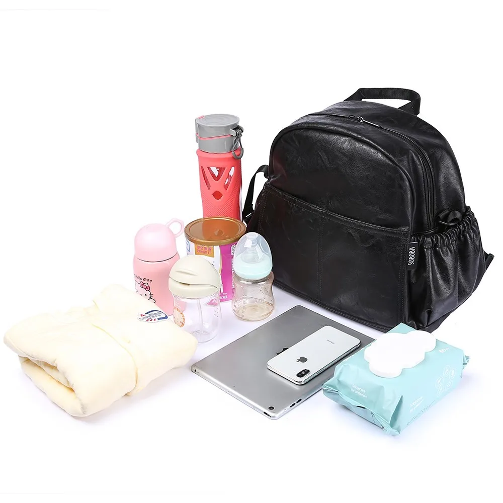 New Fashion PU Black Diaper Backpack for Baby Large Capacity Waterproof Pockets Diaper Bag for Mother Travel Stroller Bag